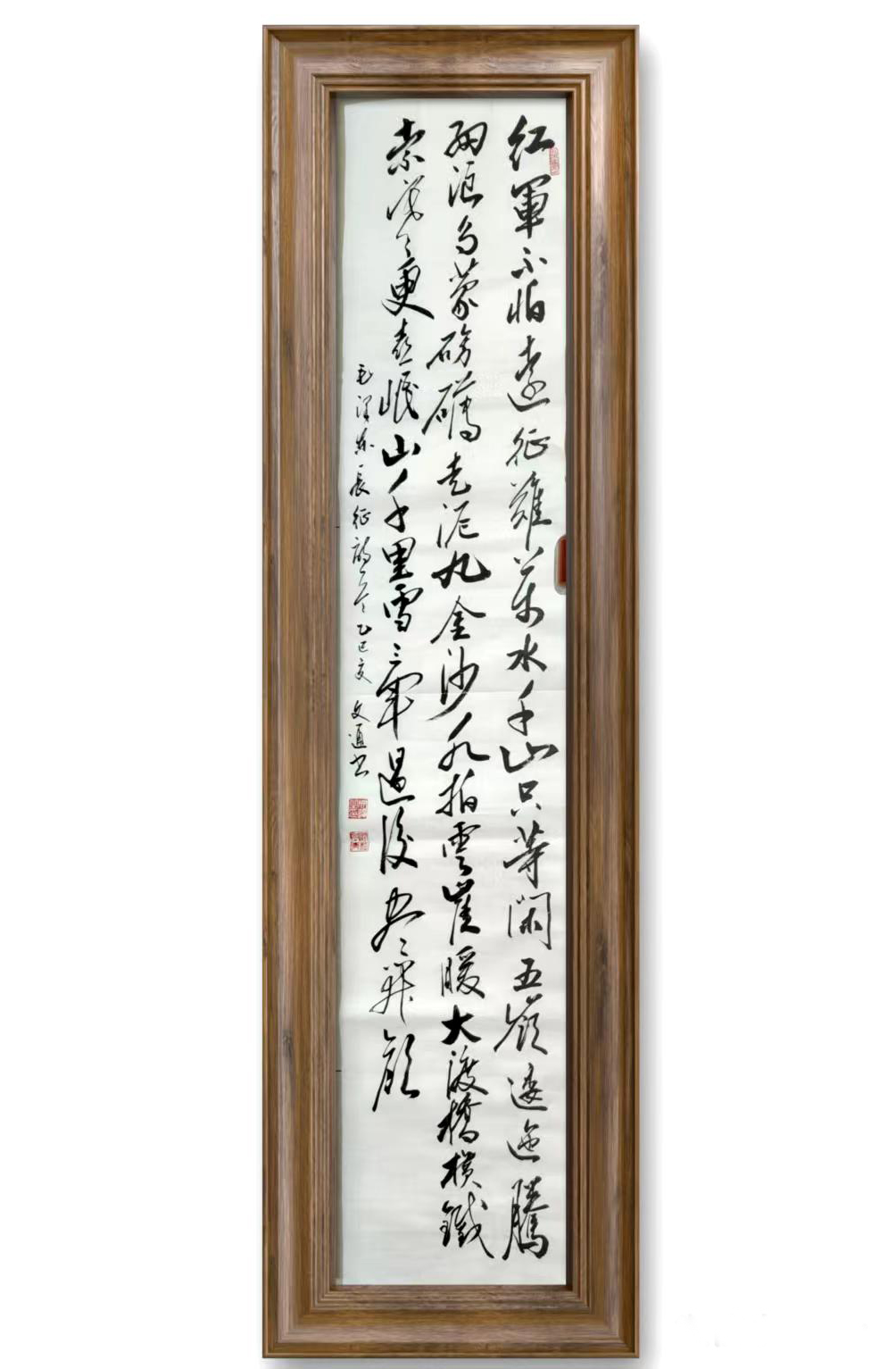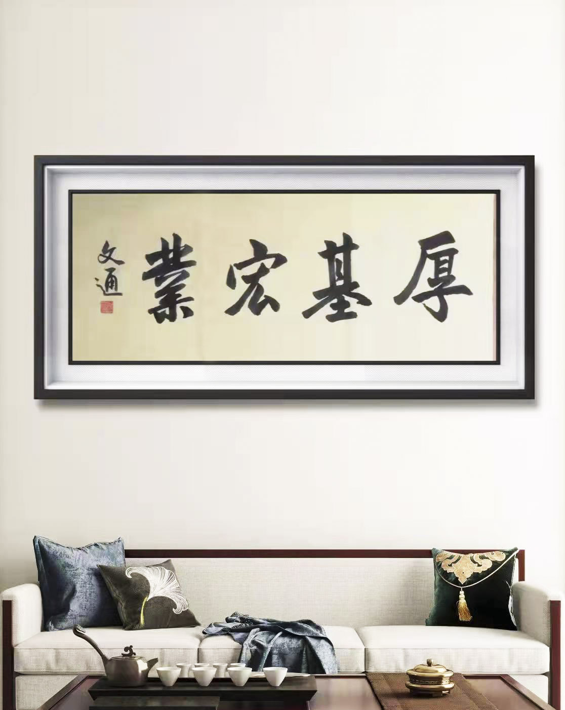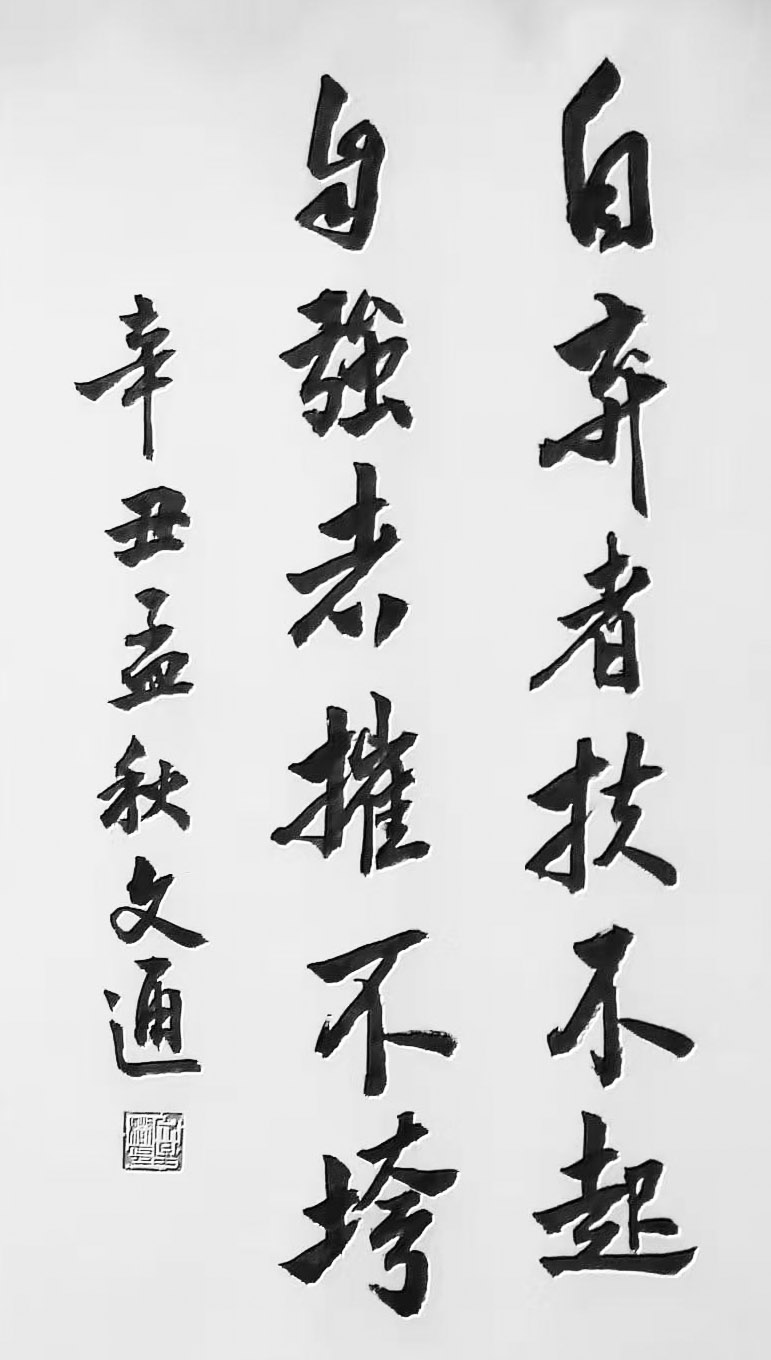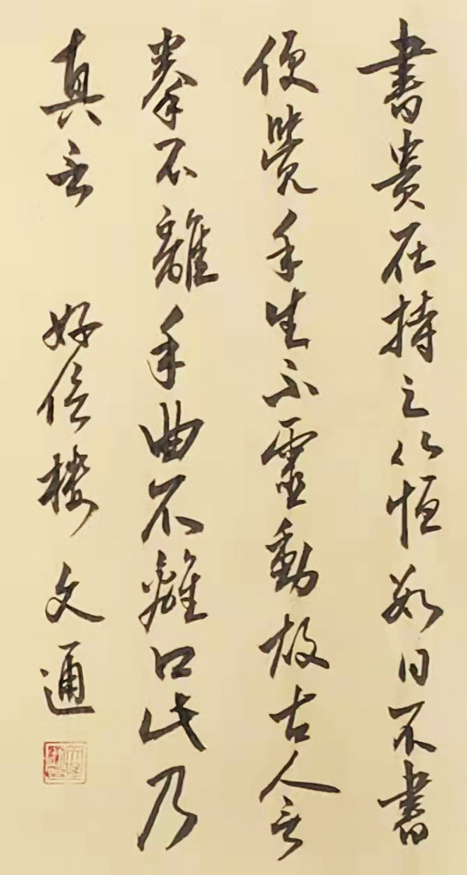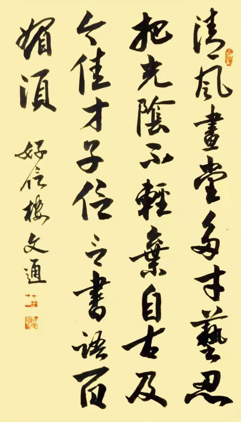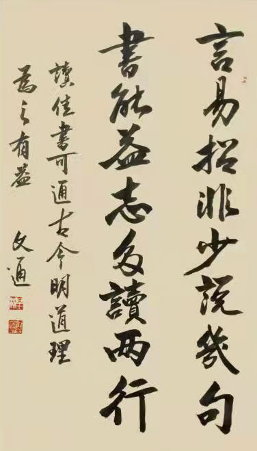 文通先生自幼忠爱书法,醉心书道数十年。其作品,运笔流畅、章性洒放、风格独特,稳健中渗透着洒逸气韵。笔力充沛、正而不板、宕逸多姿、独树一帜,大气磅礴既有欧阳询之“险”,又有顏真卿之“厚”,更显二王书法风味之韵。字体结构雄伟豪放,笔画精细点点俱到,着墨圆润细腻,运笔灵动巧妙,字字错落有致、气神贯通,韵味雅致,具有极高的欣赏价值,沉着苍劲,雅俗共赏,从点画、字形都呈现出独有的艺术魅力!