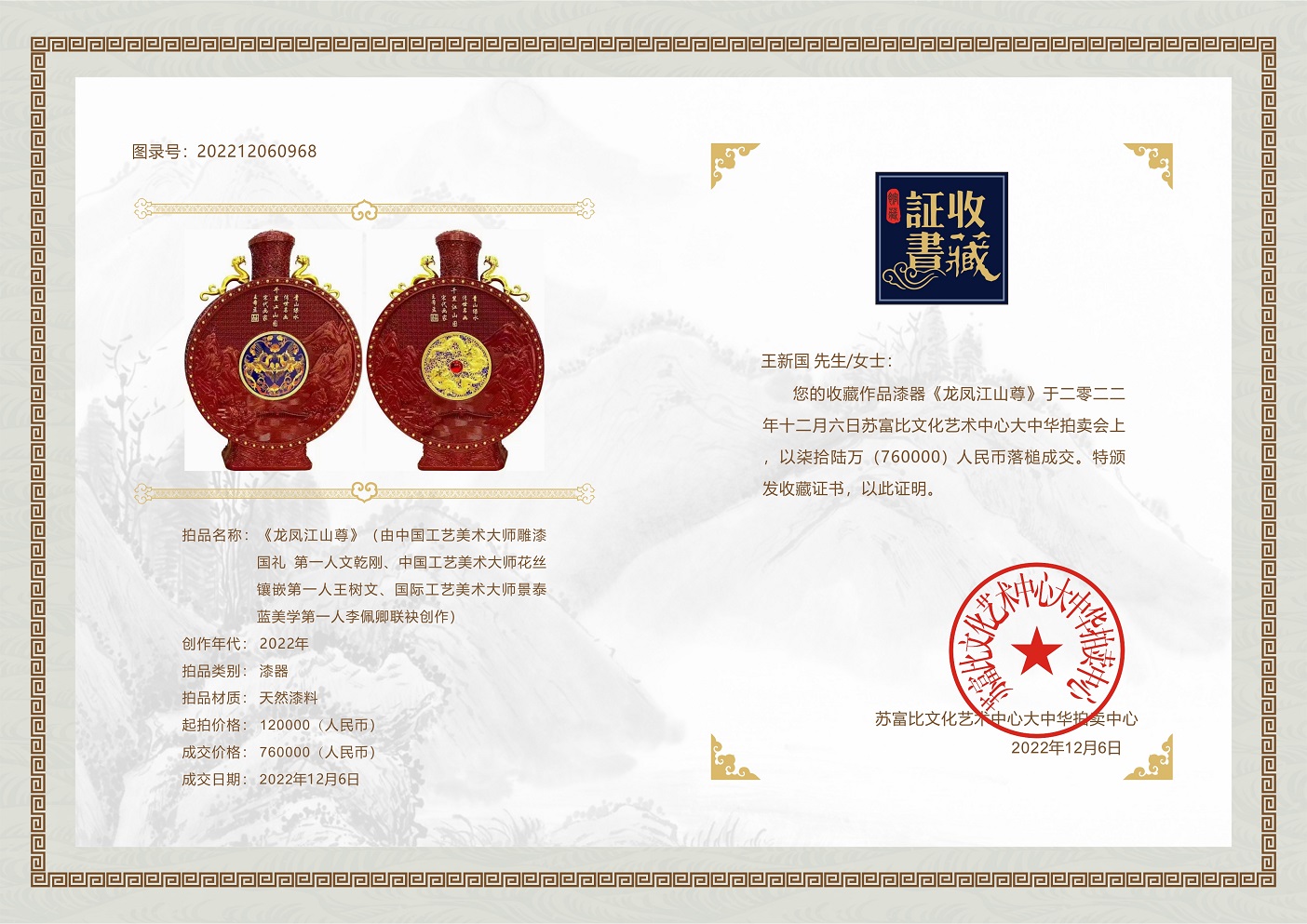 - 收藏家王新国,安徽人,中国收藏家协会会员、国家高级艺术品鉴定评估师、中国国际新闻杂志社收藏院副院长。曾获誉:“世界华人爱心慈善公益大师、国礼艺术鉴赏家、德艺双馨艺术收藏家,人民艺术收藏家”等称号。